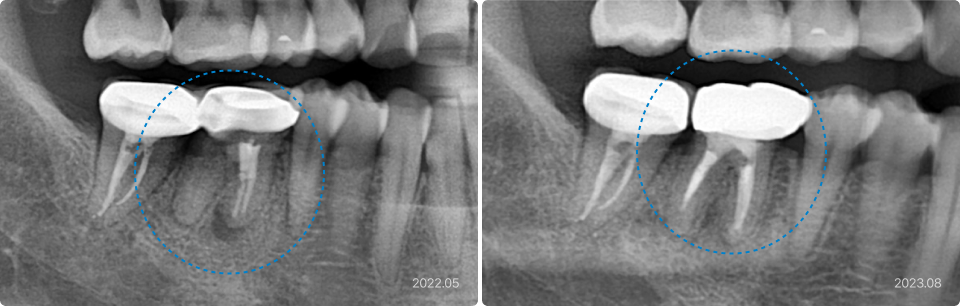 - 크라운 안쪽으로 2차 충치 발생 및 신경관 중 일부가 치료되지 않아 염증 발생