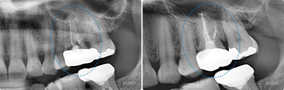 신경치료가 된 치아 뿌리에 염증이 재발하거나 확대되는 경우